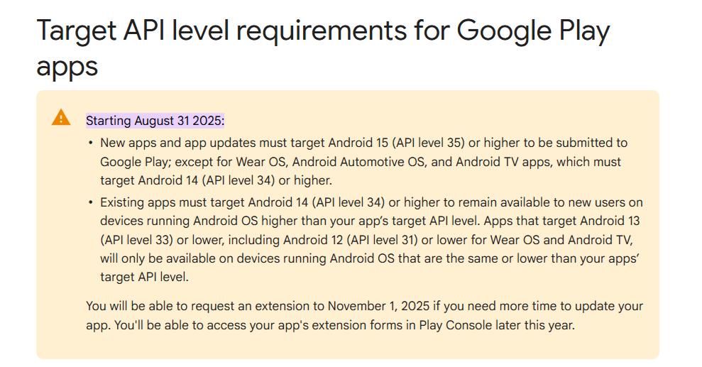 Google напоминает, что с 31 августа 2025 года все новые приложения и обновления в Google Play должны быть нацелены на Android 15 (API 35). Существующие приложения должны иметь Target API не ниже Android 14, иначе они перестанут быть видны новым пользователям на устройствах с более свежими версиями Android.