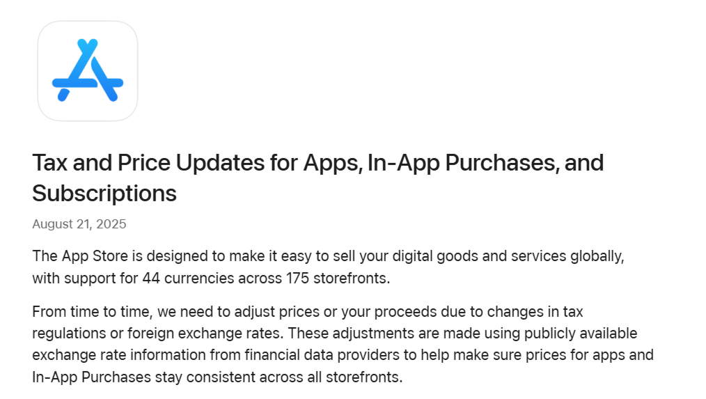 21 августа Apple объявила об обновлении налоговых ставок и цен в нескольких странах. Изменились расчёты выплат и цен для разработчиков в Бразилии, Канаде, Эстонии, Румынии, на Филиппинах и во Вьетнаме с учётом новых налогов и ставок (повышение НДС, отмена цифрового налога и т.д.)