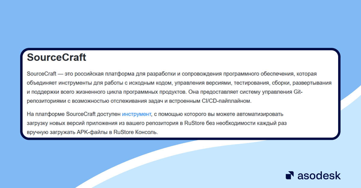 Платформа разработки SourceCraft от Яндекса получила интеграцию с RuStore: теперь приложения можно автоматически публиковать в RuStore Консоль сразу после сборки.