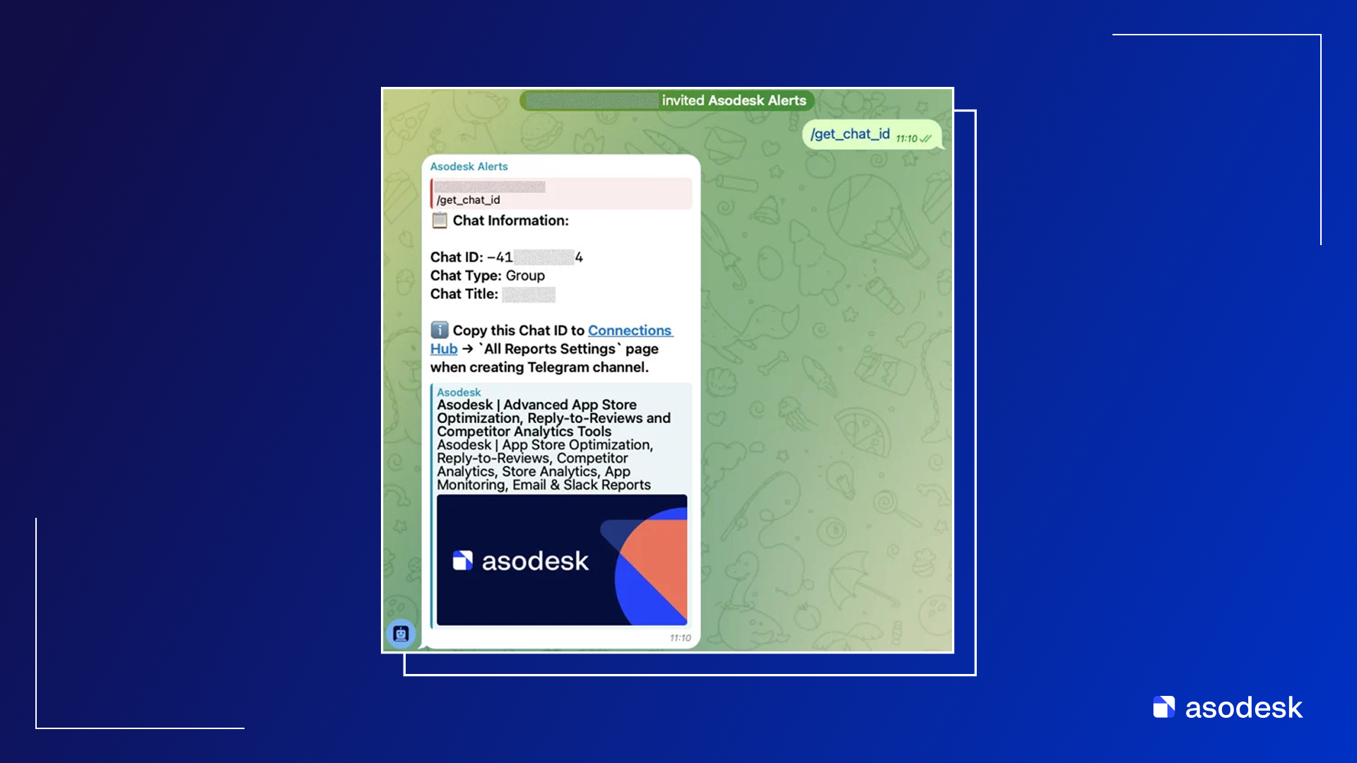 Для настройки отчетов и уведомлений в Telegram необходимо подключить бота и получить ID для настройки уведомлений в Asodesk. Бот подключается как к Telegram-каналу, так и к групповому чату.