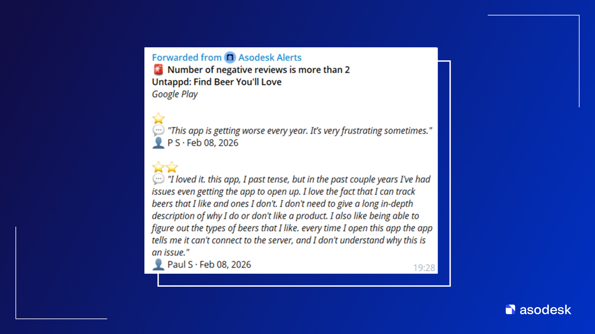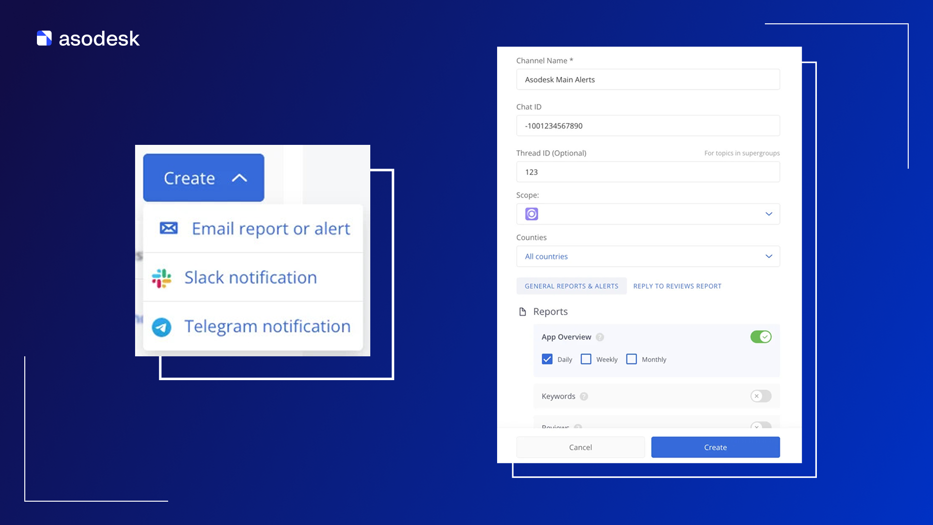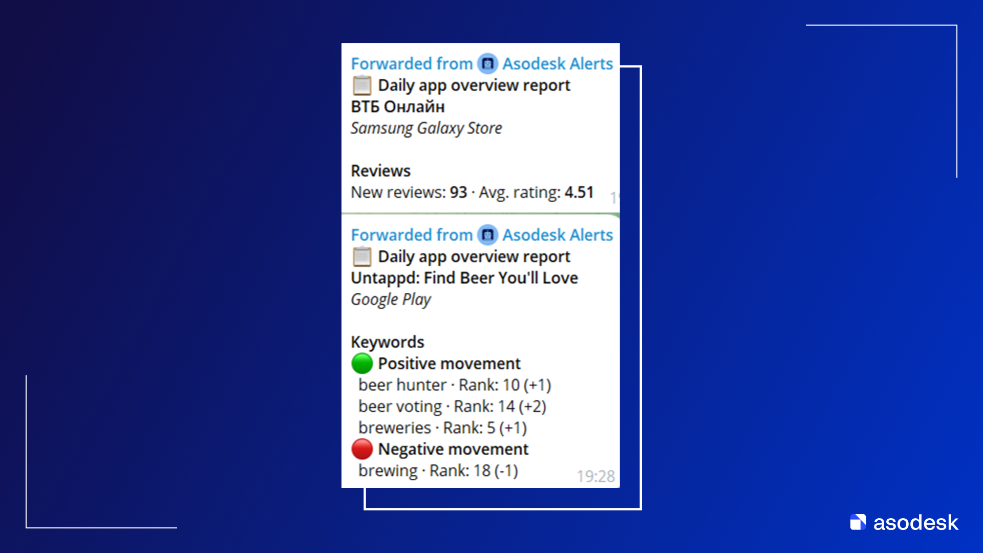 Теперь Telegram в Asodesk поддерживает все типы отчетов и уведомлений наравне с Email и Slack — а также позволяет отвечать на отзывы пользователей в мессенджере через бота.