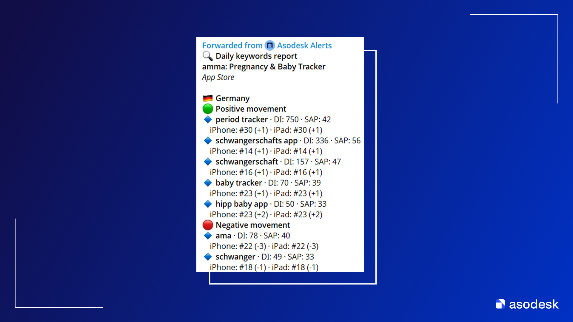 Отчет по кейвордам — еще одна возможность интеграции с Telegram. В таком отчете можно изучить популярность ключевых слов и проследить изменение позиций приложения по ним с течением времени.